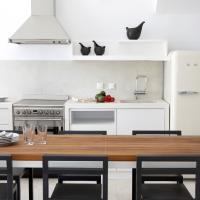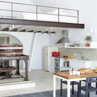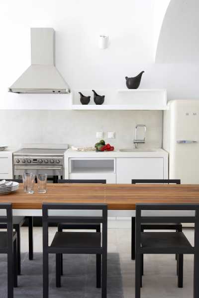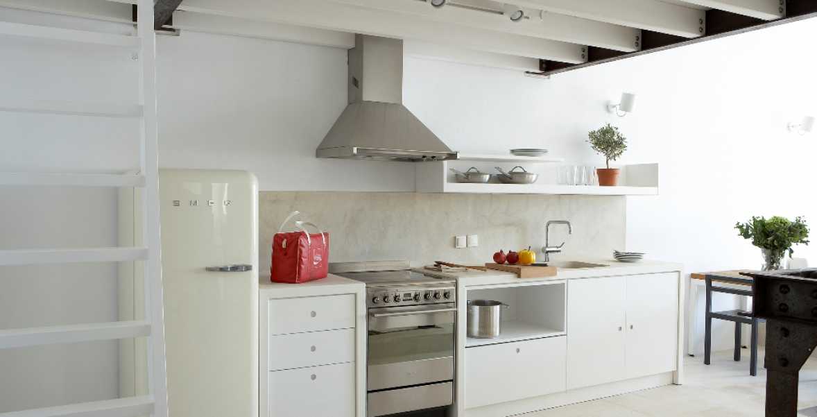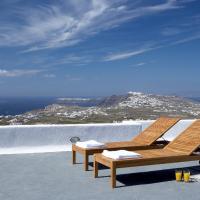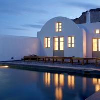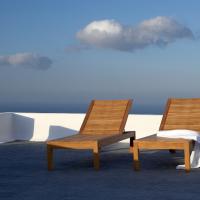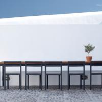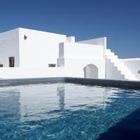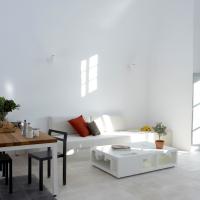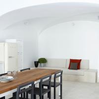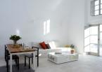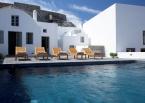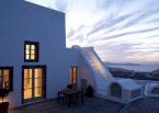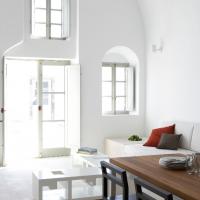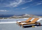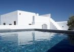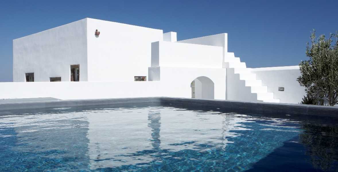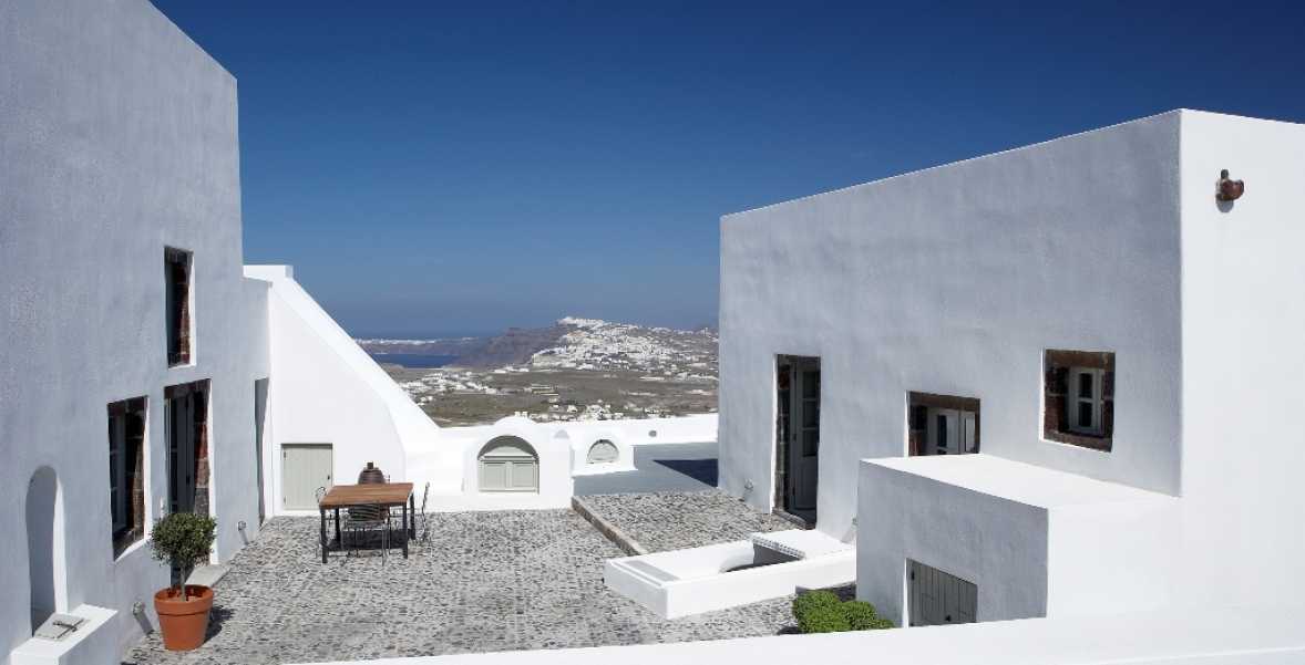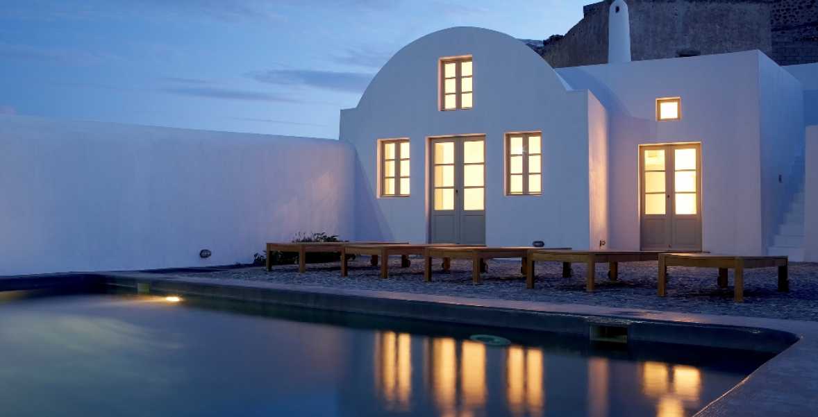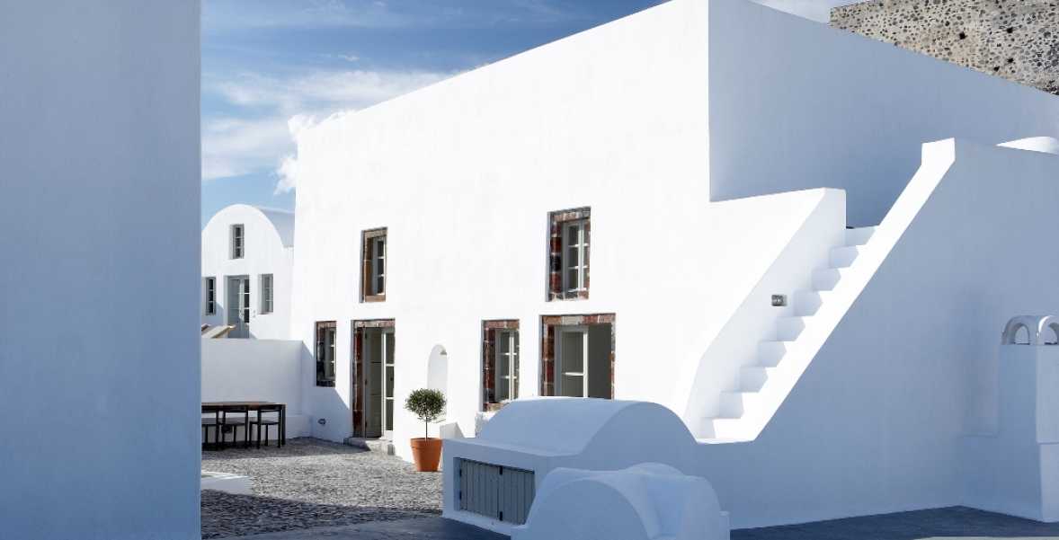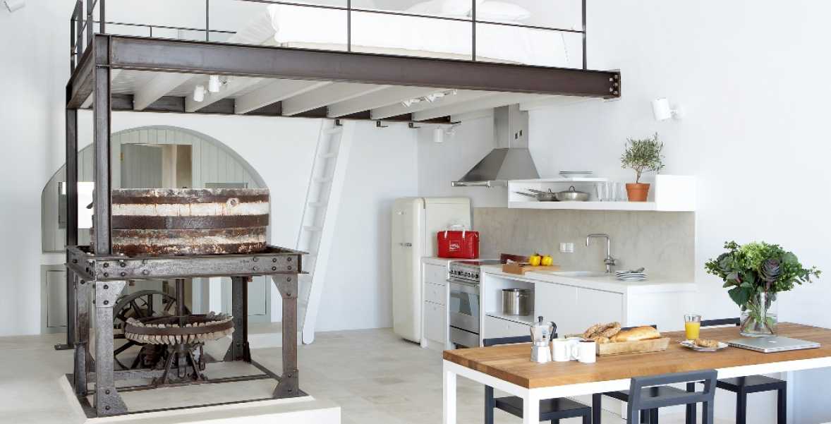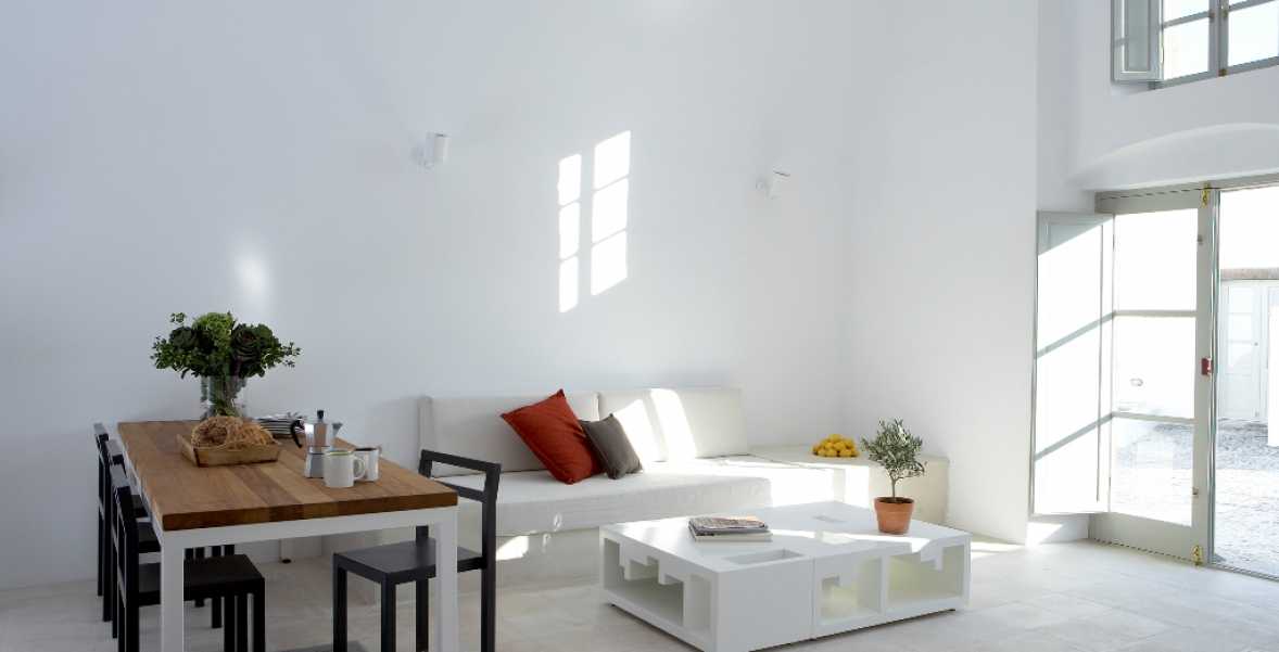 The property has a very sleek and minimal loft-style design, and has been restored with a deep understanding for its traditional Santorini architecture using the old style of polished cement and eco-friendly materials. Elements of the factory have been incorporated into the design, and a huge piece of machinery stands like a magnificent sculpture as the centerpiece of one of the numerous living spaces.
