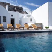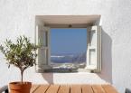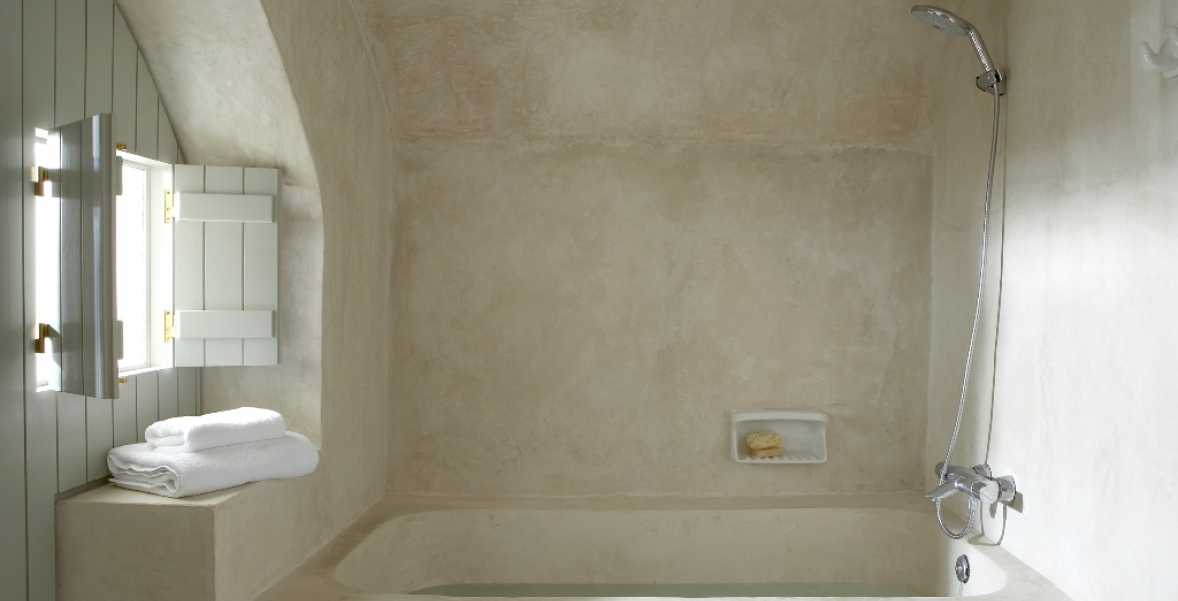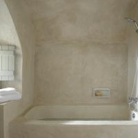 Located underneath the Castle of Pyrgos, one of the most important fortresses found in the island, restoration took years of meticulous research and careful study, so that the end result would be in harmony with the striking surroundings. The floors were painstakingly created by a local craftsman, who mixed colors and cement to create the beautiful matte finish throughout.