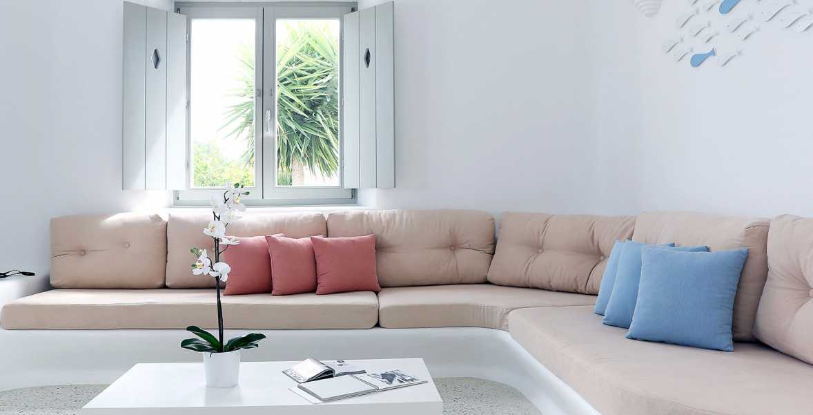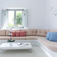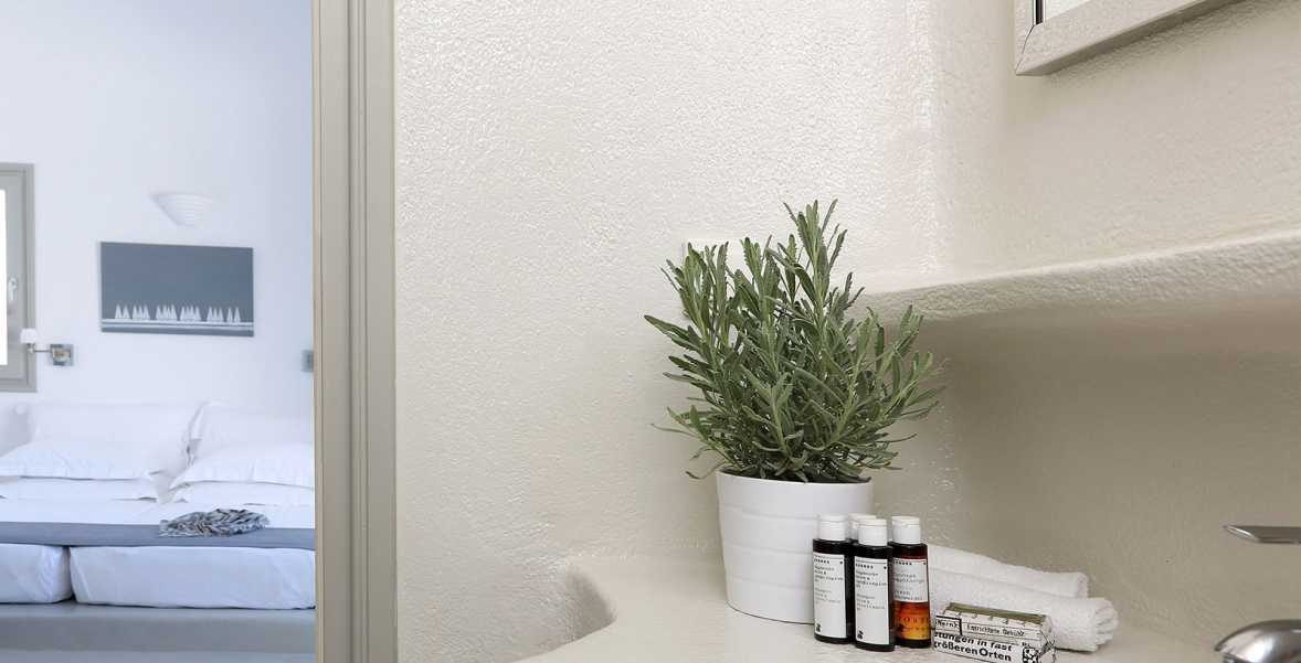 In addition, there is a balcony with a sitting area, built-in hydromassage and deck chairs, where you can enjoy beautiful view of Naoussa bay. Going up the staircase onto the first floor, there is another large en-suite bedroom with a double built-in bed and another private balcony with great view of Naoussa and Kolymbithres.