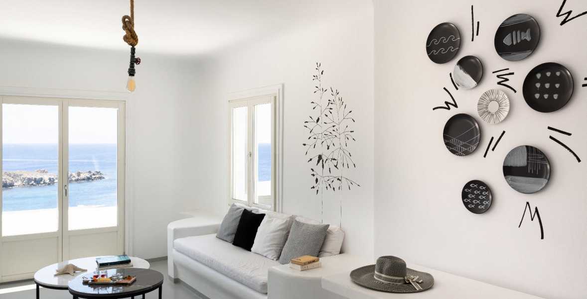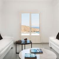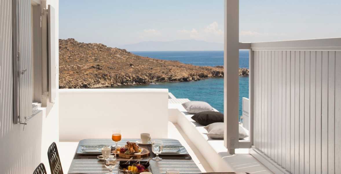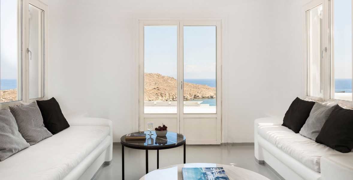 The private balcony has a breathtaking panoramic view of the Aegean Sea and the unforgettable Mykonos sunrise. Situated just above the private beach at Glyfadi cove, this two-bedroom and the two-bathroom villa also provides a fully-equipped kitchen, a spacious living room with a cosy dining area, and a private balcony.